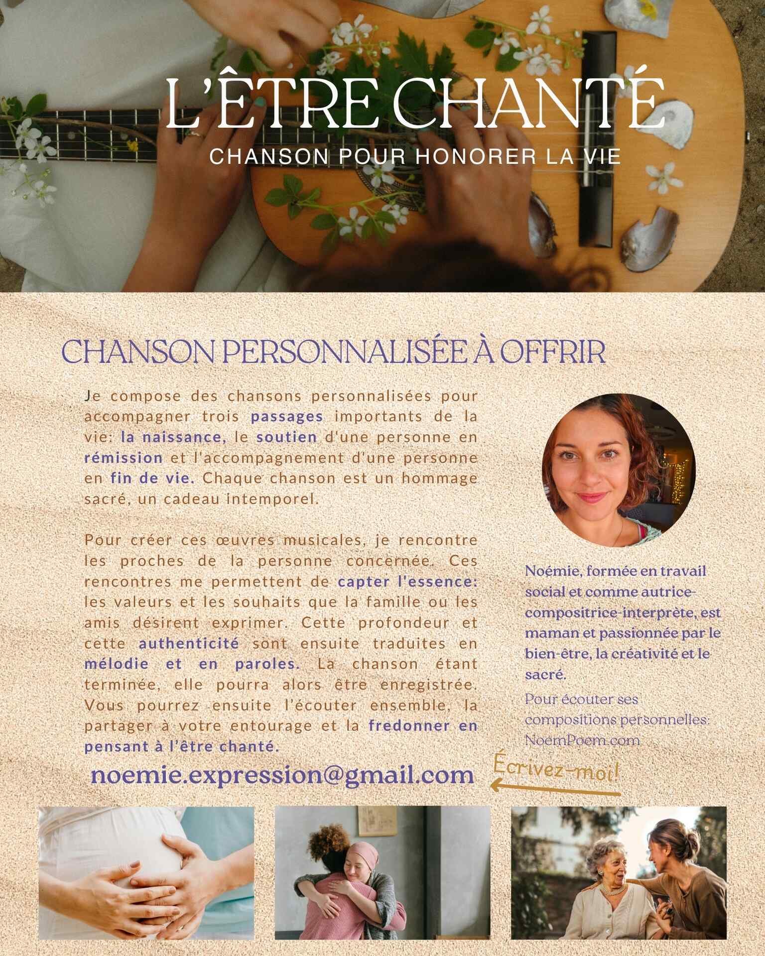 Les mots, les mélodies et la voix prennent forme en résonance avec l’histoire, l’intention et le vécu de la personne ou de la famille accompagnée.